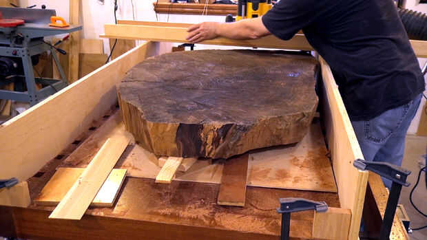 Había escuchado que usando un corte de ascenso dejaría una superficie limpia y ayuda a dirigir el polvo hacia el conducto de polvo, pero en la práctica no parece hacer mucha diferencia. Solo con cuidado y metódicamente moví la plantilla hacia adelante y hacia atrás a través de la losa hasta que llegué al final. En mi caso tardó dos pasadas para conseguir perfectamente plana.