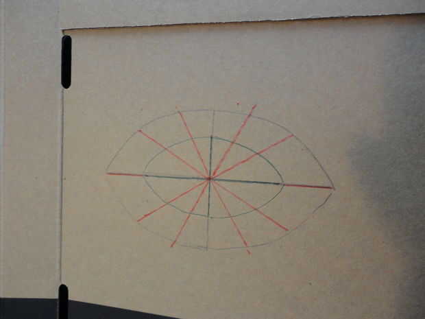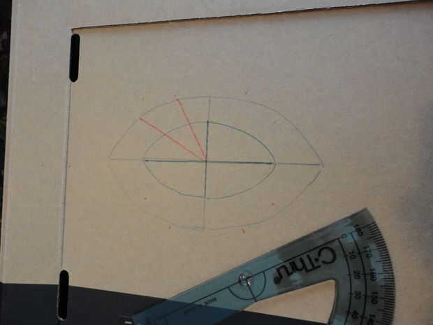En este paso, vas a necesitar un transportador. De la línea (no importa cuál) Mida y marque los ángulos de 30 grados y 60 grados. Desde el punto de centro, trazar una línea hacia fuera hasta el final del óvalo, en las marcas. Repita para todas partes del óvalo. También vas a querer trazar la línea de 4' por lo que te acuerdas de lo de la raja. PERO NO TRAZAR LA LÍNEA 2'. Todas las líneas rojas en la imagen son las que se cortará. Debe tener un total de 10 ranuras.