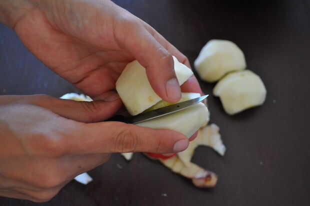 Pelar las manzanas y cortar cada uno en dos partes.
