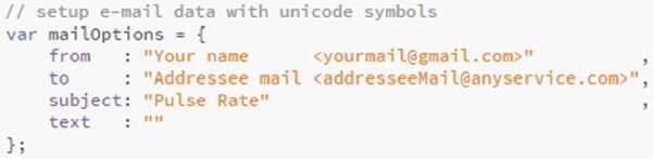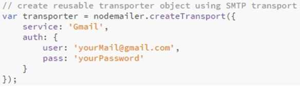 Configurar opciones de correo en el archivo sendMail.js. Encontrar la variable del transportador (ver figura anterior). Escriba su dirección de correo electrónico en el campo "usuario" y su contraseña de correo electrónico en el campo "pass" (usted puede utilizar a diversos servicios como Hotmail). Luego buscar la variable mailOptions (ver figura anterior) y modificar el campo "desde" y el campo "para". Escriba su dirección de correo electrónico y nombre en el campo "de", así como la dirección de correo electrónico y nombre de la persona que va a recibir el correo electrónico en el campo "a".
