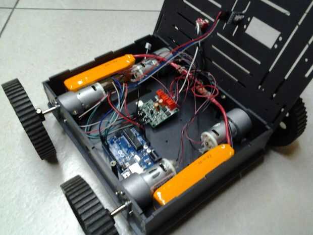 Es que un coche de 4 ruedas impulsado por un par de 12v baterías de 2200 mAh Li-Po. 4 motores de la C.C. de alto par motor le dan una velocidad máxima de par motor de 900 RPM y 12 Kg/cm. El MOSFET IR7843 base doble controlador de motor DC puede manejar hasta 20 amperios y 18 voltios.