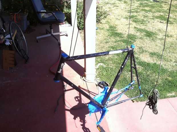 Desafortunadamente, mi moto utiliza un pedalier de taza-y-cojinete bastante esotérica y no tengo las herramientas para eliminar, ni un lugar en Phoenix que vende (y la cooperativa donde construí la cosa se cierra el sábado), lo que significa que tuve que dejar las manivelas y abajo soporte (el soporte inferior es pasan de las manivelas) en la bicicleta durante el trabajo de pintura. Mi herramienta de cadena también desapareció, lo que significa que no pude quitarlo, por lo que la cadena tiene cubierta en cinta, así.