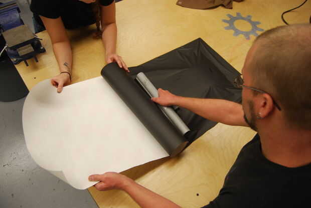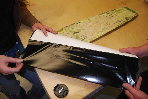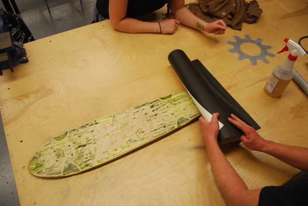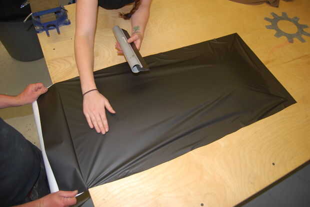 Humedecer bien la superficie con agua jabonosa o RapidTac. Pelar unas pocas pulgadas de vinilo del papel del forro, y se adhieren a esa sección desde el borde de la superficie (en este caso la tabla). Tirando el vinilo de tensión, comience a aplicar a en la superficie quitando el papel del forro y lo establecen. Siga el rollo con una escobilla de goma para mantener el vinilo liso. Si se producen las arrugas, pelar el vinilo hasta desaparecer, aplique más RapidTac o agua jabonosa y continuar como antes. Continuar hasta cubre toda la superficie.