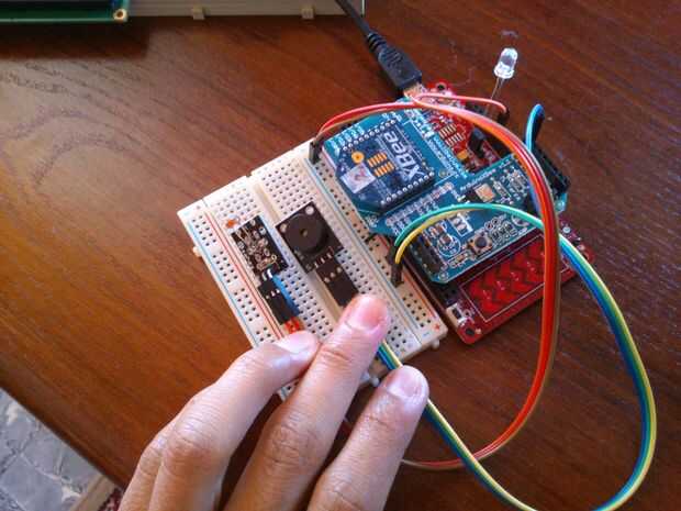 Vemos aquí hemos usado la XBee Shield. Es importante decir los PSoC no suelen llevar unos pinos están en la zona central de la placa y permiten la alimentación de la XBee shield, por lo habría soldarle a la placa.