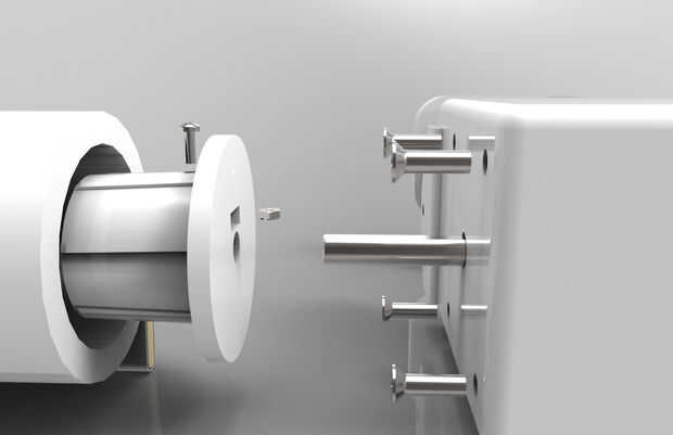 3. ahora vamos a arreglar el axle_mount al eje del motor. Deslice una tuerca en el agujero y atornille un tornillo del lado a arreglarlo. Ahora presione el soporte del eje en el eje de la persiana. Debe ser un ajuste muy apretado. Al pulsar en push sólo en el anillo externo axle_mount, no la carcasa del motor ya que esto podría dañar su motor.