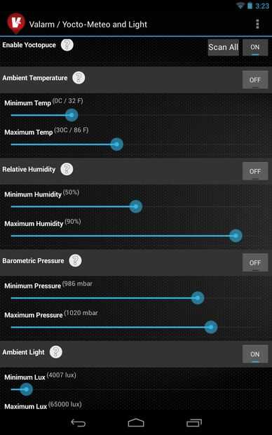 Instalar Valarm Pro en el dispositivo. Configurar Valarm para el desencadenador de sensor de luz por ir a todos los ajustes -> Yoctopuce -> luz en Valarm Pro y Yocto-Meteo.