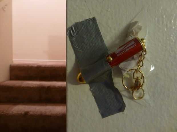 Un trozo de cinta adhesiva y un recibo de restaurante arrugado forman nuestra alta tecnología, infinitamente ajustable, sistema de montaje.