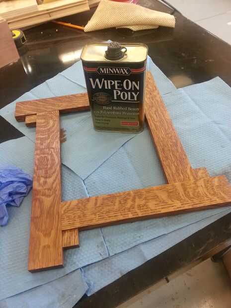 Una vez más, vamos a utilizar el poli. Sacúdalo bien real y luego poner una capa ligera en él. Creo que no puedo insisto capas ligeras bastante. No corro en muchas situaciones que requieren una capa pesada de nada. Recuerde, el deluente la capa, más rápido se seca. Eso significa menos tiempo para conseguir burbujas de aire, puntas de polvo o cualquier otro problema. ¿Partes brillantes? Frótelo con un trapo. Porque esto es un espejo y va a colgar en una pared, no estar viendo mucha manipulación, así que voy a poner dos capas. Si yo estuviera haciendo un pedazo de muebles, y esta fue la tapa de tabla, podría ir hasta cuatro capas. Una vez más, usando lana de acero entre capas.