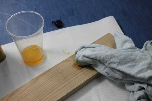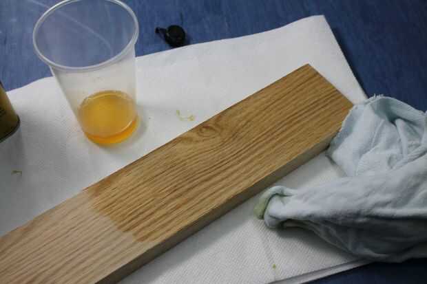 Dar la lata un batido antes de comenzar. Abrir la lata y transferir una pequeña cantidad en un vaso de plástico o un viejo envase de yogur. Coloque una pequeña cantidad de acabado en el paño y frote sobre la madera. Usted debe intentar aplicar un acabado uniforme sobre toda la pieza, esto es muy fácil de lograr. No inundar la superficie y no deje ningún exceso en la superficie. Tardará 3-4 horas para esta capa se seque.