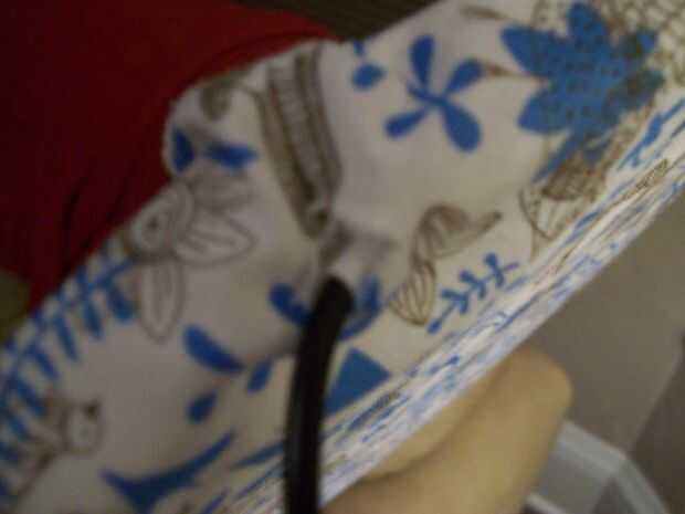 Una vez que tenga una estructura de cubierta de la lámpara, es hora de conectar el LED. Coloque el cable en el extremo de la cinta de LED en el espacio creado en el aro de bordado más grande. Si se pega a la tela con el boquete en la parte inferior, cortar un pequeño agujero en la tela para el cable a través de la materia.