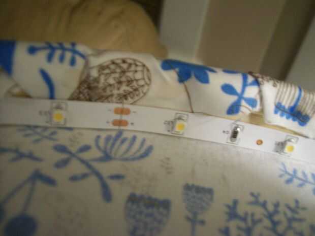 Luego, coloque la cinta alrededor del interior de su aro. Puede Retire la tira protectora del adhesivo en la parte posterior de la cinta de LED y trabajar su camino alrededor del círculo otra vez, poniendo la cinta donde usted lo desee. Coloqué mi derecho contra la tela; Usted puede elegir a vuestro centro en la línea donde se unieron sus dos aros. Lo que funcione para usted! Cualquier exceso LED puede recortarse con tijeras. Entre cada tres LED, la cinta tiene puntos positivos y negativos. La cinta se puede cortar en la línea entre esos puntos. Con el tamaño del aro, sólo tuve que recortar 3 LED desde el final de mi franja.