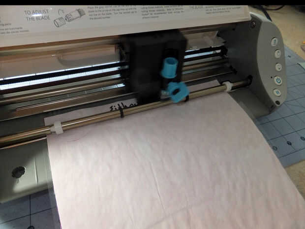 Nota – Primero probé esto con el lado de papel hacia abajo. Desafortunadamente, estos resultados no fueron estelares. Luego probé el sandwich de tela/fusible/papel, con la tela contra la estera de los bancos y finalmente tuvo un corte exitoso.