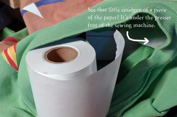 El rollo de papel que muestro en la segunda foto se llama papel estabilizador y es para colocar debajo de la tela que está cosiendo, especialmente si es elástico como una camiseta. No es realmente necesario por lo que no en la lista de "lo que necesita". Si lo tienes usarla pero no pospongas ser creativo si no lo tienes. A coser lentamente al principio para asegurarse de que usted no consigue cualquier manojo-para arriba de la tela de la camiseta. Usted no debe.