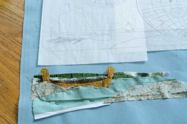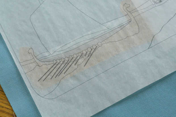 3) utilizando el diseño de papel de calco para la dirección, organizar las piezas sobre la tela de forro.