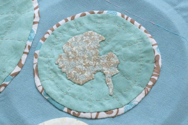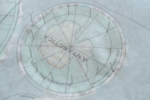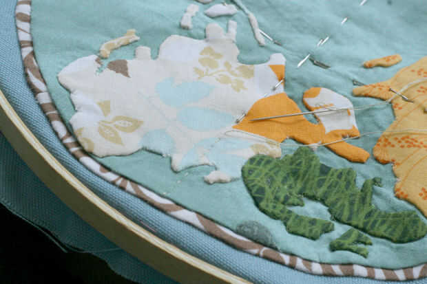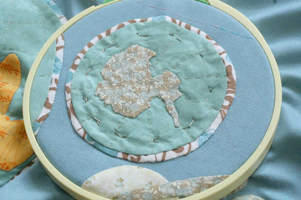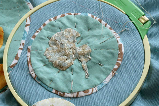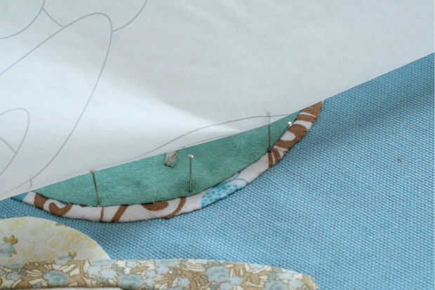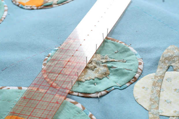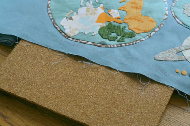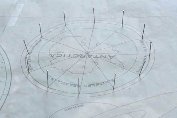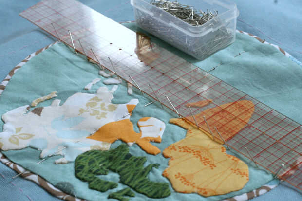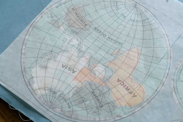 1) Alinee la composición papel de calco sobre la pieza a ser acolchados. Coloque los pernos en cada línea de latitud y longitud.