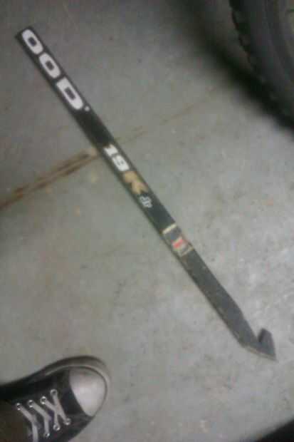 Usé un stik de hockey roto, algo bastante fácil de encontrar aquí en Canadá, para mi atlatl. Cortan el eje en alrededor de 18" y utilizar lo que quedaba de la hoja a manera de un gancho. nada extravagante, ojo solo mirado todo y cortar con una sierra para metales.