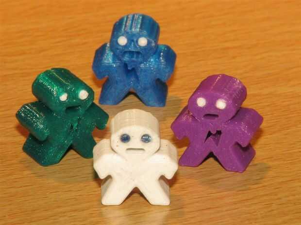 Las piezas no son una impresión de 2 color. Se imprimen con agujeros y un trozo pequeño del filamento se pega en los ojos. El blanco usa contrastes bien con los zombies oscuros. Usé el filamento azul para los ojos de los humanos. La bobina es 1,75 mm filamento (PLA o ABS) que muchas impresoras 3D. 3mm (el otro diámetro común) es demasiado grande para usar con este tamaño de pieza.