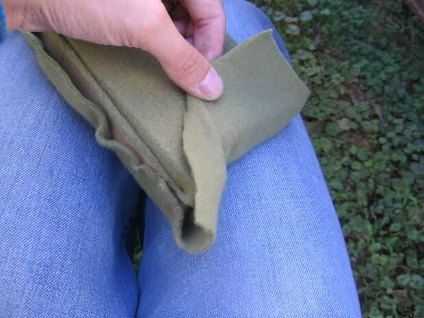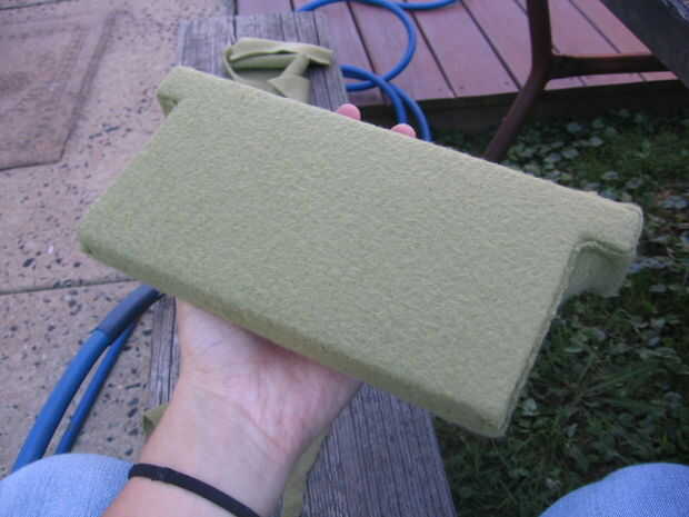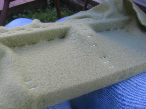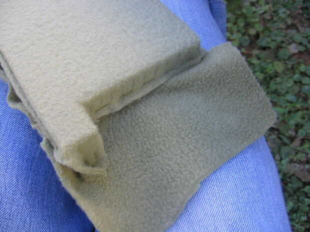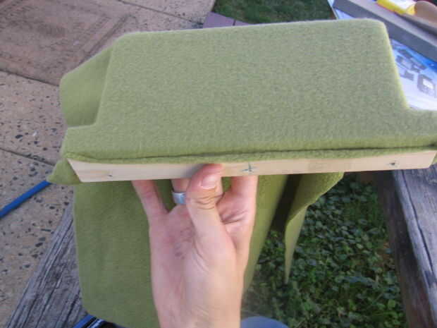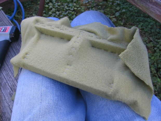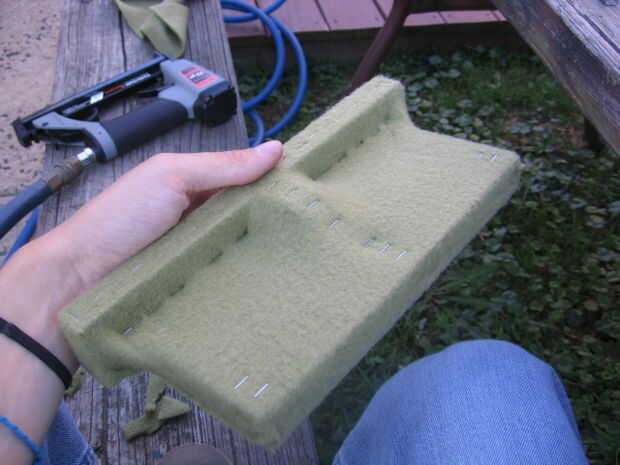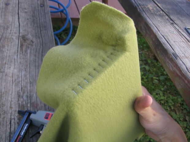 Para este proyecto, no realmente utilizo fibra de vidrio y tela polar. Paño grueso y suave es de uso frecuente para el trabajo estético de fibra de vidrio donde se desea una cierta forma, pero no necesariamente requiere de la fuerza de fibra de vidrio. Como lana es elástica, forma fácilmente sobre una base de madera como este. Para mantener el paño grueso y suave conectado a la base, utilicé una grapadora de tapicería neumática para fijarla. Envuelve con el paño grueso y suave era realmente difícil pasar sin problemas (valga la redundancia). Muchas grapas... muchos más eran necesarios, fueron utilizados para sostener el paño grueso y suave en la base. Comencé en la parte superior del apoyavasos y mi camino alrededor, manteniéndolo tenso todo el tiempo y fingir que era presente de más difícil que envolver el mundo.