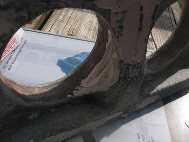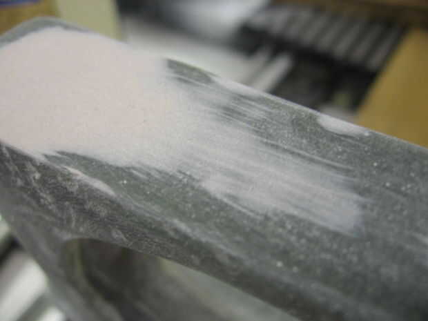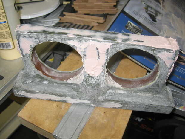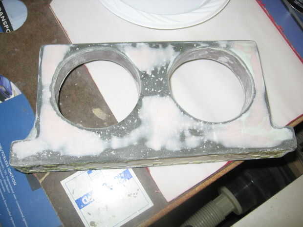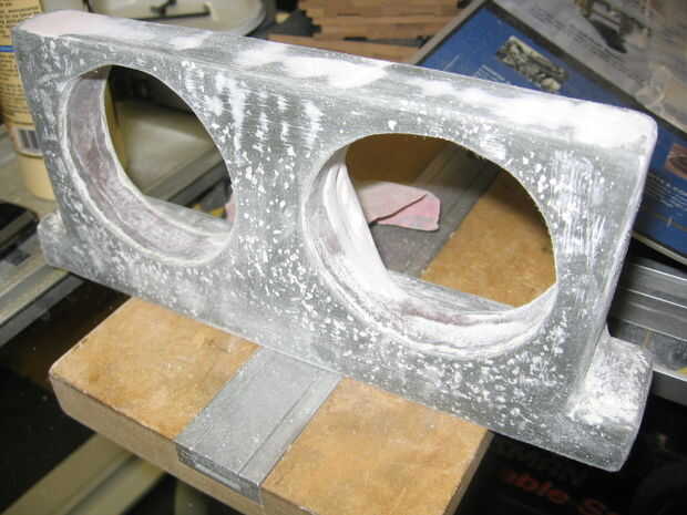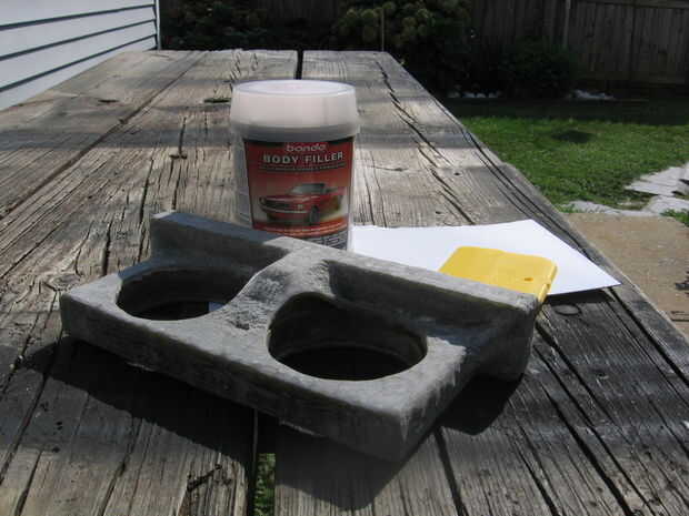 Mezclar algunos bondo y, usando un raspador, se aplican a los puntos bajos. Tratar de cubrir la cosa entera (menos la parte posterior). Rellene todos los vacíos que desea rellenar. Cuando usted la arena, que no desea tener una capa de bondo, que desea pulir a la lana y fibra de vidrio, pero permiten el bondo llenar los vacíos. (ver fotos)