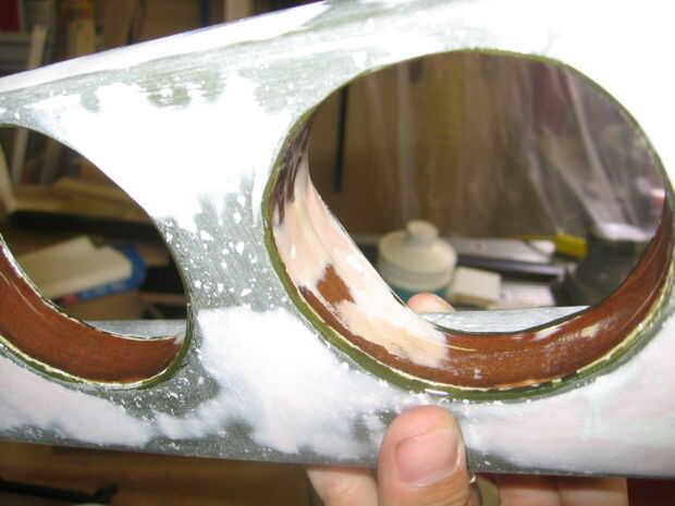 En los recortes circulares (los titulares), te darás cuenta que es solo madera. Este es un tema como las tazas podrían sudar (condensación) y causar la madera (MDF) se hinche, y esto no es bueno. La solución a esto es a la arena por algún tumor en las aberturas, mezclar una pequeña cantidad de resina de fibra de vidrio nuevo y Aplique uniformemente alrededor de los titulares. Puede agregar más endurecedor para esta parte para que la resina