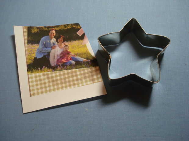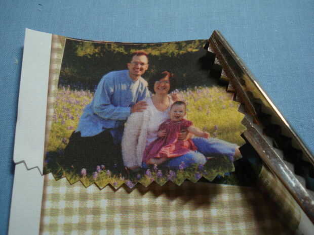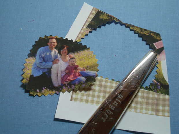 Cortar la imagen de la foto de la hoja impresa tela colorfast. Ahora recorta la imagen en la forma deseada. Me gusta usar tijeras dentadas para hacer esto ya que da un borde decorativo agradable. Puede usar cortadores de la galleta para hacer las plantillas de forma o utilizar un cortador rotatorio con una lámina decorativa para recortar tu foto impresa de la tela.
