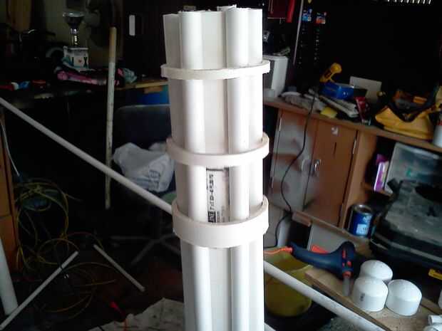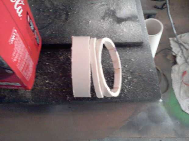 Tomar el sobrante de 4" tubo y cortar 2 finos anillos y 1 anillo ancho y cortar pequeñas muescas donde los barriles van con una dremel. Pegar los anillos del cañón a partir del gran primero.