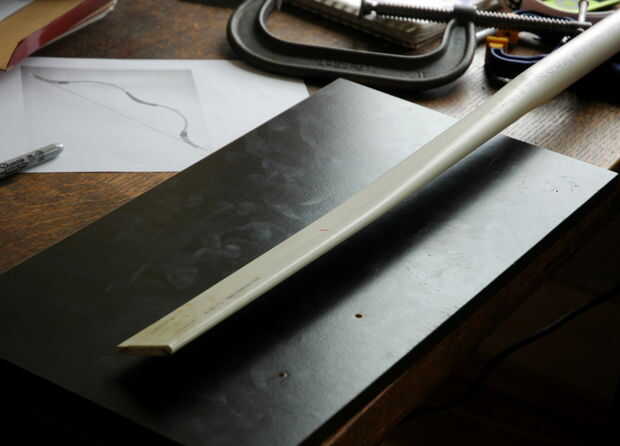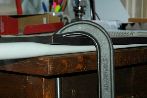 Colocar el tubo de la calefacción en su vicio. Usé una simple tabla en la parte superior de la tabla, usando el borde de la mesa como una guía para mantener la extremidad recta. Fijarlo con la abrazadera hacia abajo (un asistente sosteniendo que la pipa es una gran ayuda aquí). Parece más realista que si hay una ligera conicidad, es decir, el tubo es más delgado en el extremo que la media.