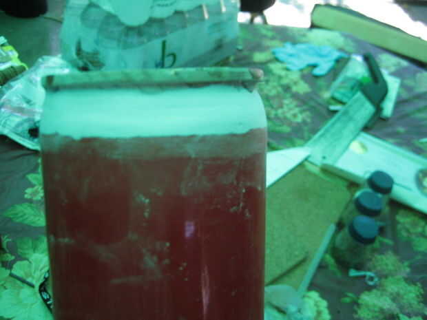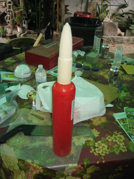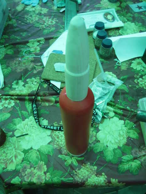 Ajustaron todos los componentes de madera para el metal extintor de incendios con resina de 5 minutos. La primera parte que ajustaron para el extintor de incendios fue la punta de madera que se convirtió en el torno. Yo estaba parado el extintor verticalmente y coloque la punta. Han consultado la punta desde todos los ángulos para ver si se ve recto. Después de asegurarse de que era recto cuando se ve desde todos los ángulos, permití el epoxi secar.