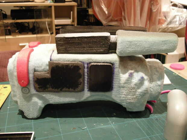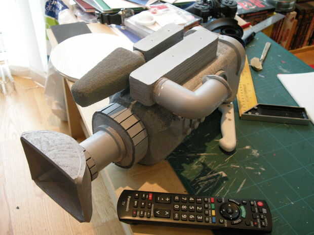 Para la primera cámara que hice utilicé izquierda sobre espuma de cuando hice Audrey para el cuerpo principal de la cámara y para la segunda cámara utiliza espuma de poliestireno, más rígido y más fácil de tallar hacia fuera la forma. Tallado hacia fuera la forma del cuerpo y luego utilizadas pedacitos de cosas como espuma tablero, base del rodillo de tocador, plastazote etc.. Aerosol pintado toda la cámara una vez que todos los bits fueron pegados en (base de capa, a continuación, negro mate, luego metálico) entonces pintaba pequeños detalles para terminar la mirada.