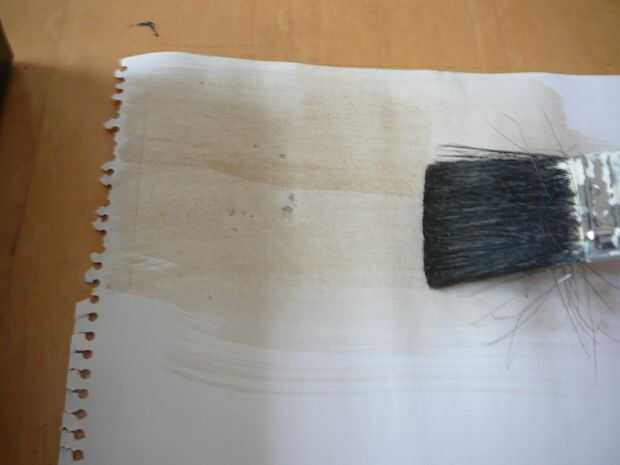 Mojar un pincel en el café (o té) y pintar el papel con él hasta que lo cubra. Puede cubrir la superficie de trabajo con el papel para no mancha el café.