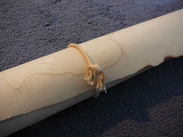 Luego ruede para arriba y atar alguna cadena alrededor de él. Utilizar cuerda antigua o mojar en el café a lo de la mancha.