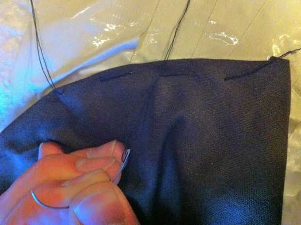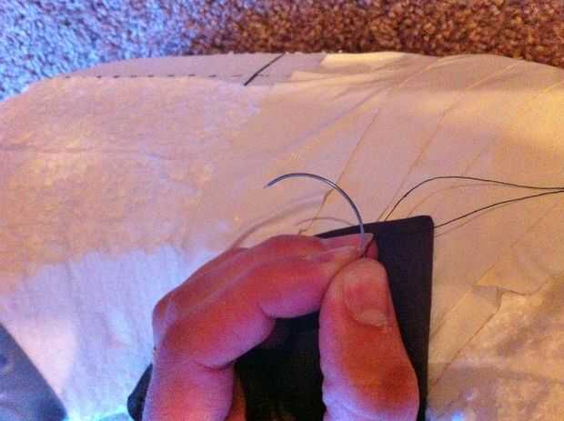 Para iniciar una banda, tender el extremo de una tira de una zona de anclaje con cinta del conducto y utilizar hilo y aguja para coser la tela en el anclaje. Adquirido un conjunto de agujas curvas para facilitar este proceso, pero eran realmente más fáciles trabajar con agujas rectas.