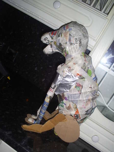Todo era papel mached y sujeté las piernas usando rodado encima del periódico y cartón corigated. Recomiendo usar 4 capas de tiras de mache.