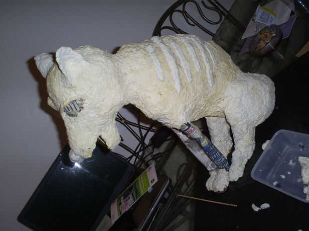 arcilla de papel maché fue utilizado para cubrir el cuerpo entero y agregar algunos detalles. Esto fue hecho en pequeños pasos para que toda la estructura no colapse bajo el peso de la humedad.