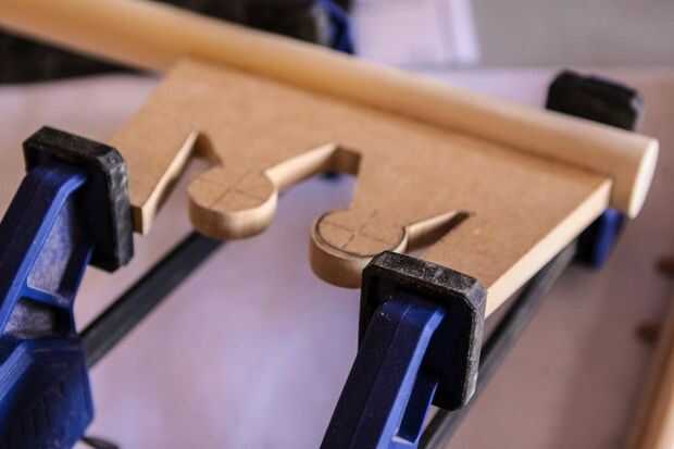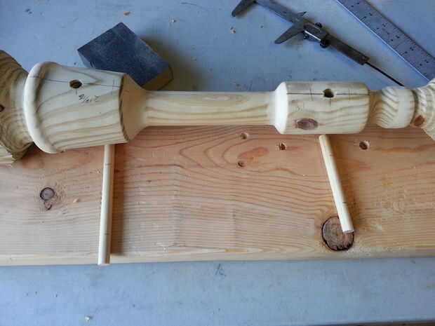 Es importante para marcar la hoja cuando se perfore con la punta hacia arriba, así que sabéis cual es, para que no se pegue boca abajo como lo hicimos con uno de nuestros anteriores intentos. Nuestros eran espaciadas en 1", 2 1/2", 5", 6 1/2" de la parte superior de una clavija de 25,5" abajo para darle una separación leve de 1" sobre la hoja por lo que se compensa un poco y no totalmente al ras de la espiga.