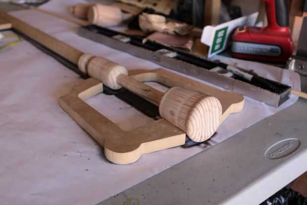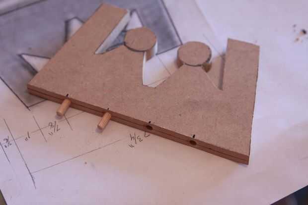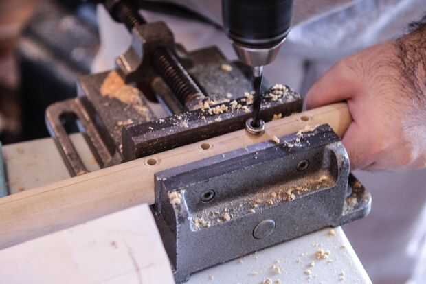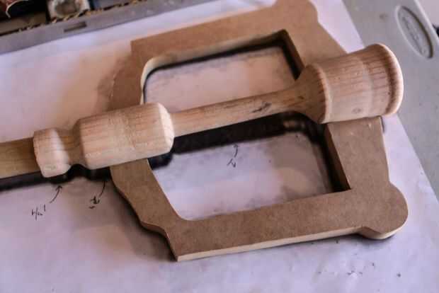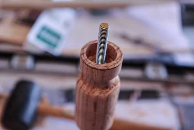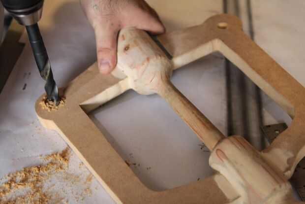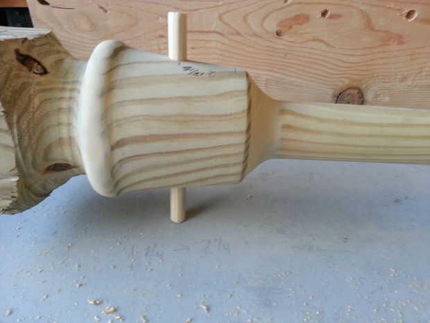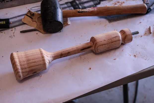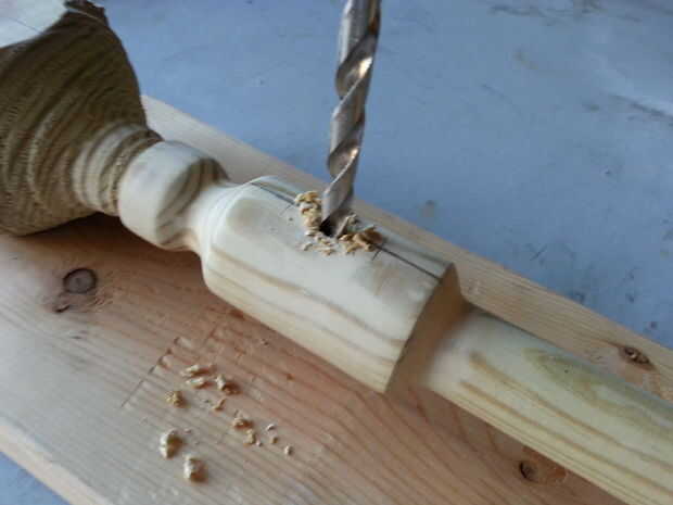 Para el protector de mano, hemos perforado con una punta de 1 1/4" para el disco caber en el hanguard lo suficiente como para que lo apoyen. Originalmente, optó por utilizar una barra de metal para soportar los dos componentes del paletón de la llave para hacer más fácil viajar con, sin embargo, decidimos un pequeño pasador de madera 3/4" fue tan bueno y un apretón más potencialmente fuerte. Si usted desea seguir esta ruta, tendrá que ser un ajuste más apretado por la barra metálica, por lo que el deslizamiento es prevenir/minimizar.