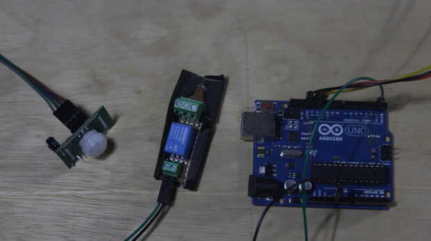 Pernos del sensor de PIR, la fuente de 5v + va a 5v o el pin 13 de arduino, la salida va a la arduino perno 12, conectar el GND a GND de arduino.