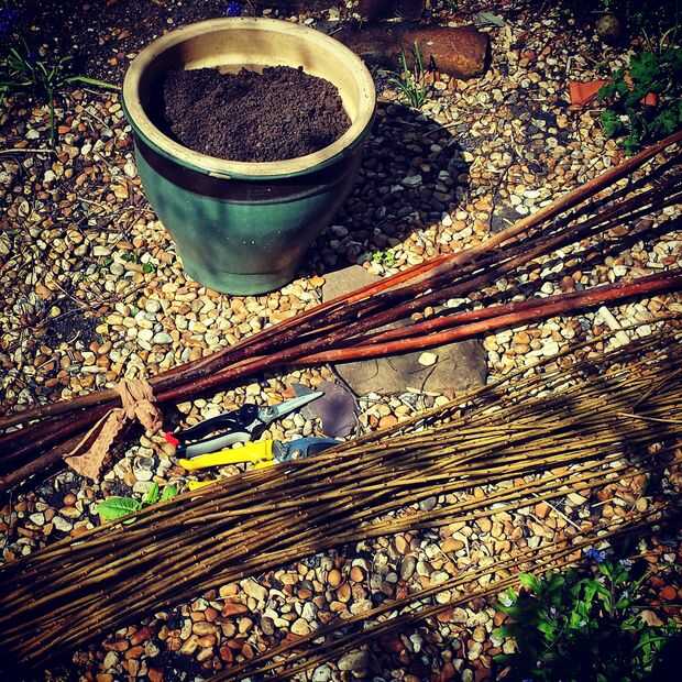 Necesita 7 sauce fuerte o palos de avellano para crear las columnas, un par de tijeras de podar, aproximadamente 15 largo flexible sauce látigos y ya sea un terreno suave a los montantes en o una maceta llena de tierra.