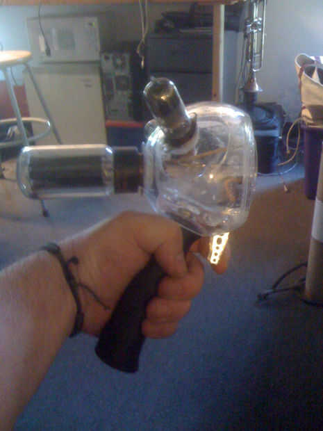 me tira los tubos desde el ámbito de aplicación y algunas de las bases del tubo. Usando un taladro de paso y una dremel, creé los agujeros para el mango y las bases de tubo. El mango solo fue tirado sin el paraguas luego un perno de carruaje fue atascado en y pegado con JB Weld. Fue unido al altavoz con una simple tuerca en el extremo del perno.