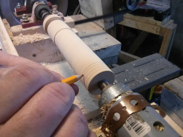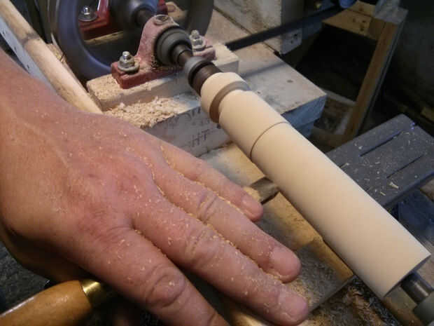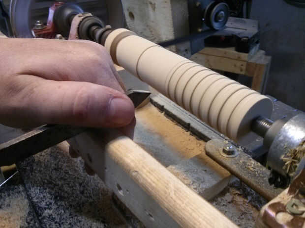 Sentido común dicta que es más fácil de quitar material de lo que es a devolver, así que tuve que ubicar la parte más alta en el mango. La anchura total de mi espacio en blanco fue de aproximadamente 1.5" y, con base en mi diagrama, el pomo fue el punto más alto. Empecé reduciendo el área alrededor de él dejando el pomo orgulloso y biselado a ambos lados usando la herramienta de partida para crear un borde nítido, con la gubia y redondo punto de quitar la mayor parte del material. Siguiente más alto fue la sección tubular junto al pomo. Disminución de la longitud entera del espacio en blanco 1/16" dándole un borde nítido con el escoplo.