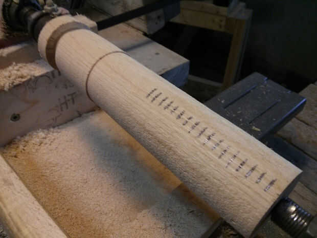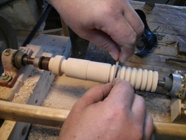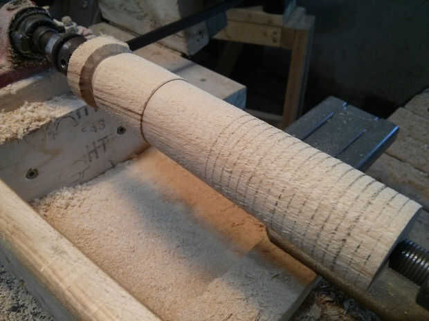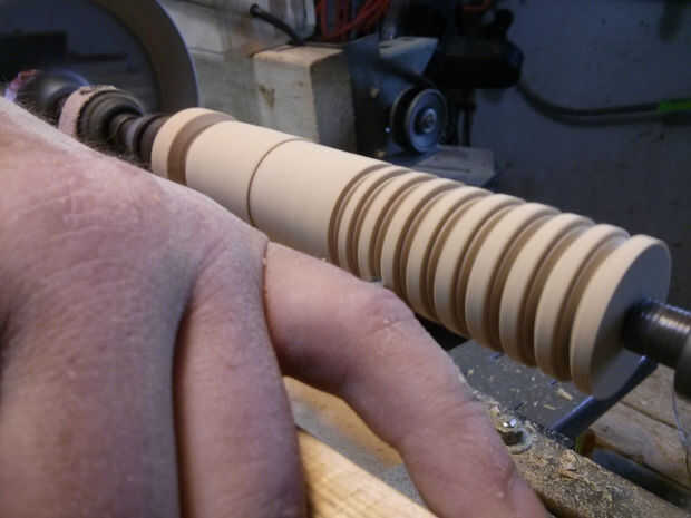 Por último, usando papel de lija de grano 100, limpiar la superficie y dentro de las ranuras. Repetí el proceso con grano 220. Lijado puede hacerse bastante fácilmente cortar una tira de papel de lija y con el torno corriendo, Drapeado sobre la pieza de trabajo. Es mucho más fácil de lijar a mano mientras la máquina hace todo el trabajo por usted.