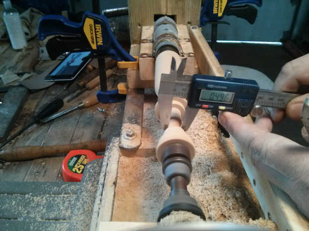 Como se mencionó antes, las secciones mediadas y delanteras debían crearse juntos, pero un resbalón en el tornillo de bloqueo en mi pie de rey y la pieza completa o bien tendría que ser rehechos, o cambia a tres secciones. En cambio, decidió crear un enchufe cónico que. 497" grueso (del tamaño de mi granito de arena más grande) que se inserta en el mango.