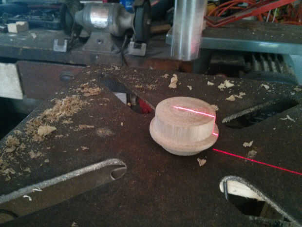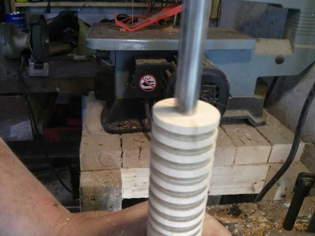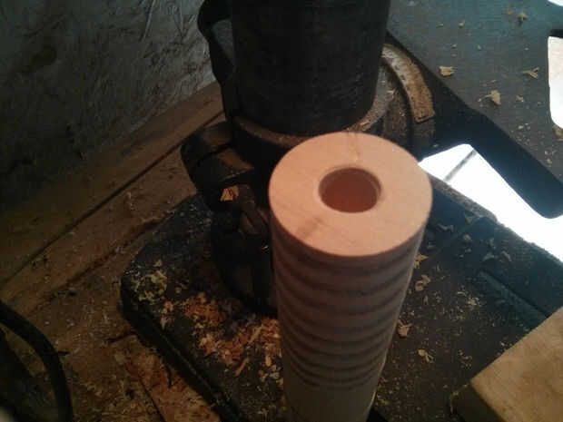 ¿Por qué eligió crear un. 497" zócalo? Porque es la broca más grande tengo antes de tener que utilizar una broca de pala o forstner. A pesar de no utilizarse este sable de luz, quería que las tomas a ser bastante fuerte e imperceptible. Para la manija, sujeta una tabla a través de la plataforma de la prensa y luego fijar el mango a la Junta que mantuvo estable como escaria el agujero. Utilicé una pinza recubierta de goma en lugar de la abrazadera de metal Presione para no dañar el mango. Mi torno es casera y no tiene instalaciones para perforar (sin embargo) y así que este paso debe tomarse por separado.