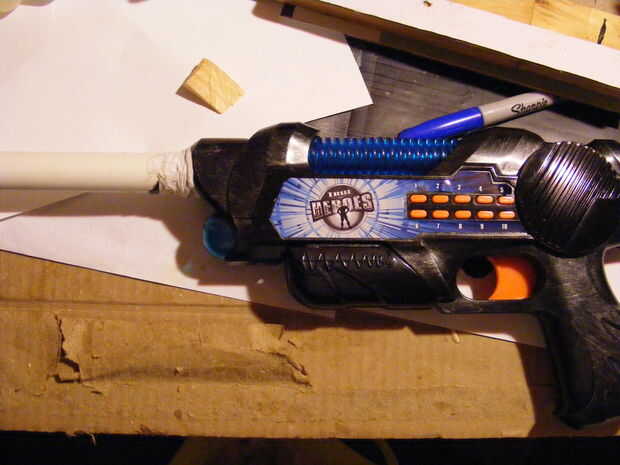 Había quitado el tapón de seguridad naranja en el extremo de la pistola para poder insertar y pegar en el extremo del tubo plástico. Hay una luz allí por lo que si mirar por el cañón, simulará el flash cuando dispara.