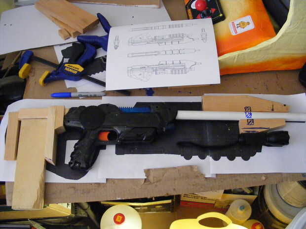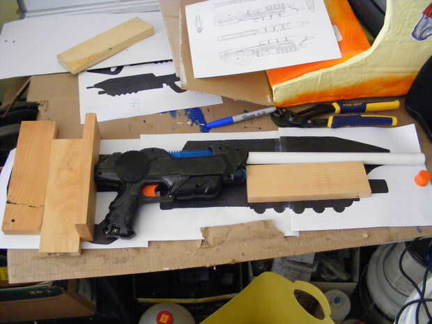 Aquí puede empezar a pensar en cómo usted acoplen todas las piezas. Pegamento no se pega muy bien a algunas clases de plásticos. Es necesario construir pegado y las superficies del cojinete. Tenga en cuenta que voy a añadir piezas de refuerzo laterales para ayudar a rodear el plástico de la pistola para que la madera permanecerá unida. Pegamentos de poliuretano (marca gorila y similares) se espuma un poco cuando está curado y llenar lagunas menores.