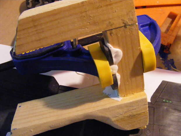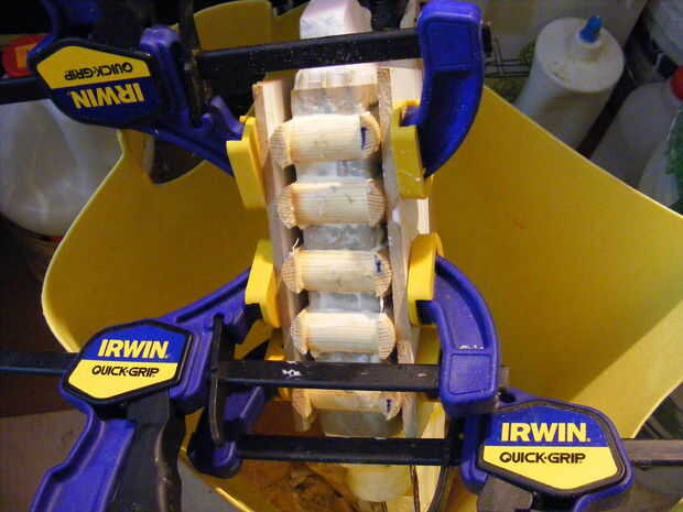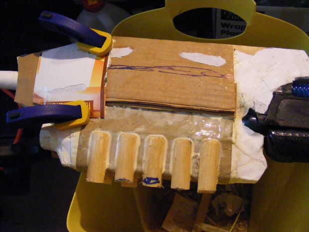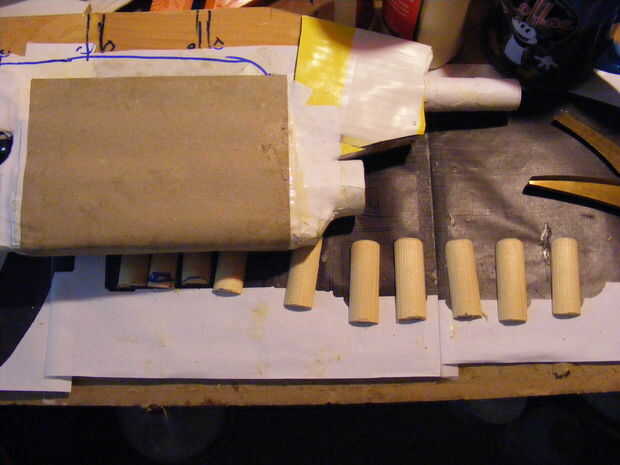 Para el foregrip, cortar piezas de moldura redonda media 1/2 pulgada. Hay cinco filas espaciadas uniformemente en la empuñadura. Una forma de U cuadrada para el agarre será suficiente pero si usted puede conseguir realmente detallado y redondo en la parte inferior de la empuñadura. Construir el agarre inferior al espesor que se siente cómodo. Pegamento las piezas y arena el exceso para completar sobre el corners.when seco. Solomillo con pegamento y rellene los huecos pequeños.