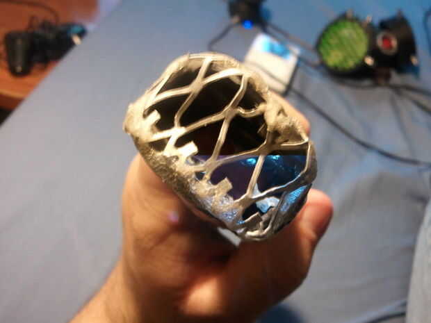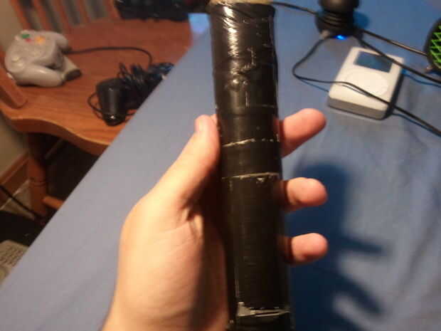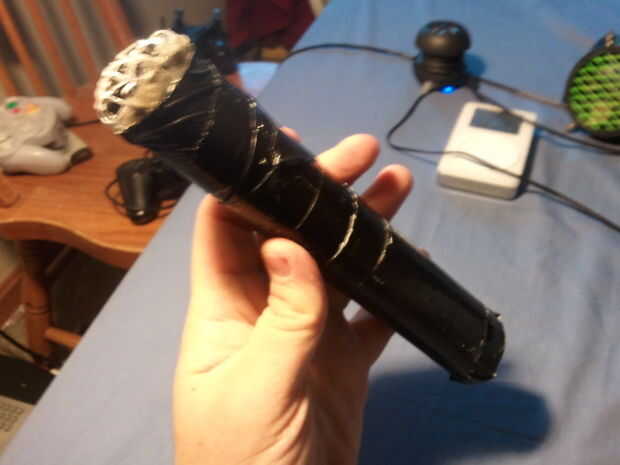 Este taser de apoyo es un apoyo pero no de juguete porque todavía pone hacia fuera aproximadamente 2300 voltios, suficiente para hacer una chispa pero no lo suficiente para herir a alguien. se hace de un viejo roto mano tenis raqueta estilo bug zapper que venden en chatarra / negociar tiendas. Corté la parte superior de él apagado y luego poner dos piezas de metal para hacer un boquete de chispa de la chispa saltar, en el futuro puedo hacer ajustable. El mango y el stock, pero puse el boquete de chispa en el mango de una pulgada y cubre el extremo con una malla / parrilla así que nadie puede nunca conseguir sorprendió incluso lo presiona en su piel.