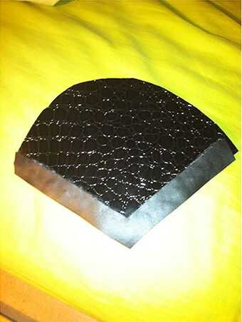 Aquí es donde empieza como el casco de la película (¡ yay!). He encontrado una tela de vinilo mate, así como un cocodrilo con textura a tela del vinilo. Utilizando una plantilla que hice, rastrear la forma en la parte trasera de la tela, cortar y les pegan. Puede ver el recubrimiento de tela mate sobre el cocodrilo uno.