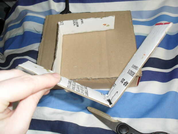 En las imágenes de las cámaras que vi, la sección de la lente de la cámara salía de una pequeña sección cuadrada, ya que los apoyos no siempre tienen que ser 100% exacto, colocado una pequeña caja cuadrada a la caja rectangular de la sección anterior (tengo hay fotos de este lo siento) del cuadro dos te da alguna idea de cómo se creó la forma. Pegué justo en el centro de la caja con mi pistola de pegamento caliente del derretimiento