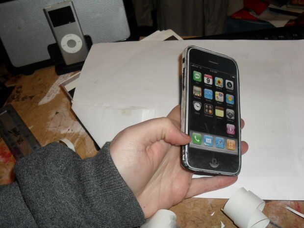 hacer apoyos para mi Scout districtos espectáculo anual de la banda y este año me pidieron dar un iPhone de apoyo, pensé oh infierno, ¿cómo hacer un iPhone? Un día preguntando por Tesco que me di cuenta de una de esas fundas para iPhones, amortiguadores de caucho que contiene una imagen de cartón de un iPhone... y luego me golpeó... Yo sólo pude hacer lo mismo